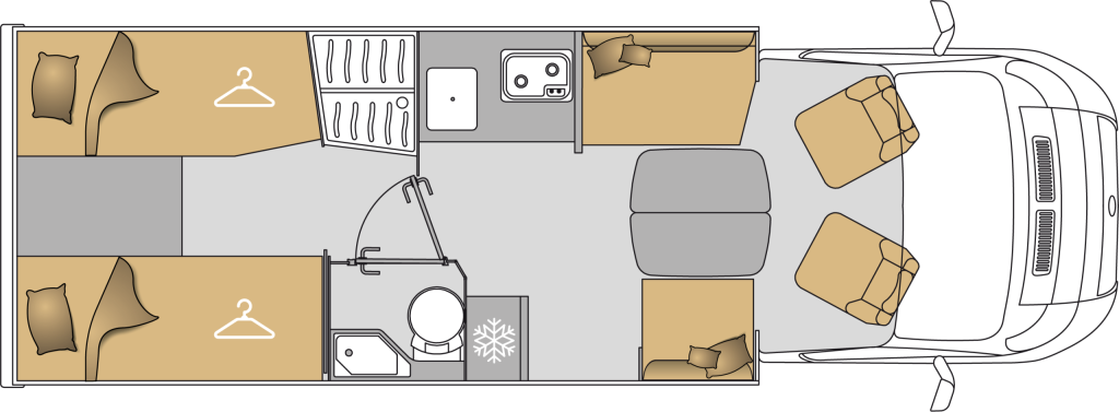 Doživite neomejeno svobodo z integriranim avtodomom, ki združuje udobje, dizajn in praktične podrobnosti. Ta inovativen avtodom ponuja vse, kar potrebujete za sproščeno potovanje v dvoje ali z družino. S prostorom za do štiri osebe – idealen za pare. Integrirana tlorisna razporeditev je bila zasnovana posebej za dve osebi, vendar zaradi pametno integrirane dodatne možnosti spanja v dnevnem prostoru ponuja prostor za do štiri potnike. Nasprotni sedežni klopi v dnevnem prostoru ustvarjata prijetno vzdušje z dovolj prostora za gibanje. Vsak del avtodoma je skrbno oblikovan in jasno ločen od ostalega.