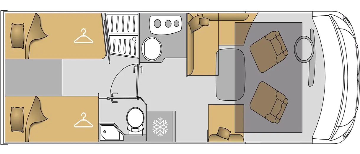 Doživite neomejeno svobodo z integriranim avtodomom, ki združuje udobje, stil in praktično prefinjenost. Mooveo INT 74EBF Élysée Line je idealni spremljevalec za sproščeno potovanje v dvoje – in zahvaljujoč dodatni možnosti spanja v dnevnem prostoru ponuja prostor tudi za do štiri osebe. Preudarna tlorisna razporeditev je bila posebej zasnovana za dva popotnika. Nasprotni sedežni klopi v dnevnem prostoru ustvarjata odprto, prijetno vzdušje z veliko prostora za gibanje. Vsak prostor je jasno strukturiran in funkcionalno ločen od drugih – za harmonično prostorsko občutje na vseh poteh. S svojo kombinacijo inteligentne funkcionalnosti, sodobnega dizajna in visokokakovostne izdelave je INT 74EBF Élysée Line idealna izbira za vse, ki cenijo udobje in stil tudi na poti.