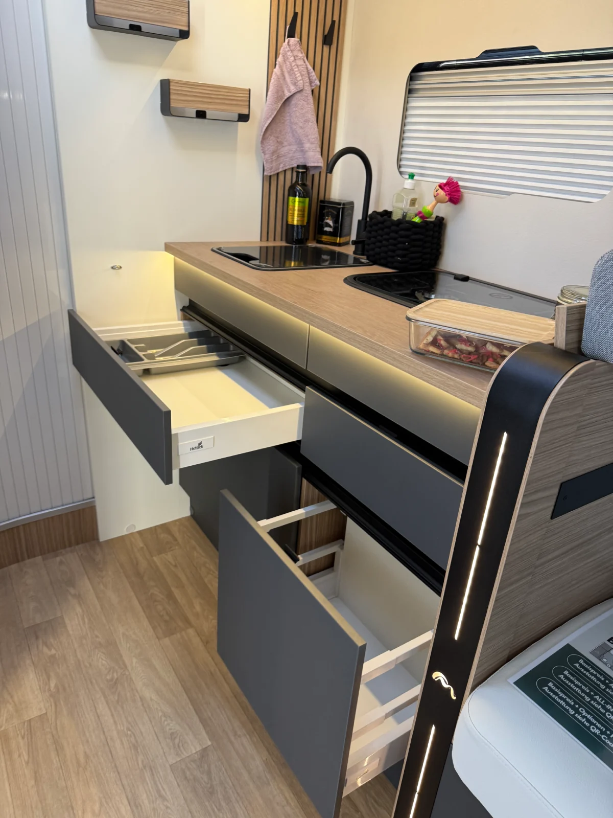 Élysée Line združuje eleganten dizajn in samostojno tehnologijo. Mooveo TEI-70DH je delno integrirano avtodom z električno dvigalno posteljo in skupno dolžino 6,95 metra – idealno za pare ali samostojne popotnike, ki ne želijo odreči udobju in funkcionalnosti. Prava posebnost je velika XXL dvigalna postelja, ki se hitro in udobno spusti. Vabi k sprostitvi in mirnemu spanju – skoraj kot doma. Praktična kuhinja ponuja veliko delovne površine in prostora za shranjevanje, kar je idealno za pripravo okusnih obrokov na poti. Prostoren AES absorpcijski hladilnik z zadostno prostornino omogoča nakup večjih količin pred dopustom – vključno s svežimi živili za na pot. V premišljeno zasnovani kopalnici najdeš ločeno tuš kabino in umivalnik, kar zagotavlja več udobja in zasebnosti. Velik rezervoar za svežo vodo zagotavlja zanesljivo oskrbo z vodo tudi na daljših potovanjih. Zahvaljujoč učinkoviti LED-razsvetljavi v notranjosti nastane prijetna atmosfera – skoraj kot doma.