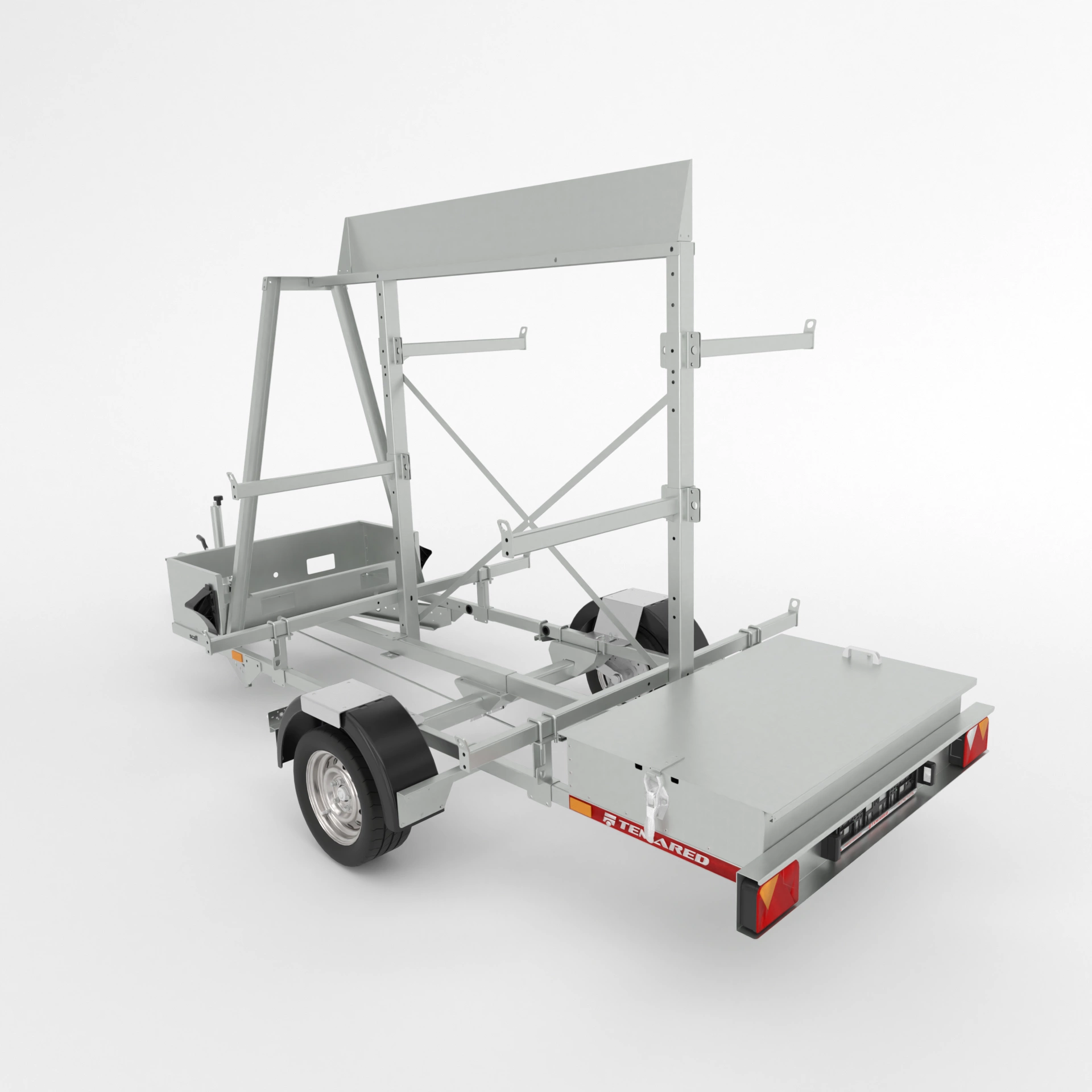 Široka prikolica z robustnim, varjenim okvirjem je zasnovana posebej za varen in učinkovit prevoz odrov. Opremljena je s priročnim nakladalnim nosilcem, ki omogoča enostavno in hitro natovarjanje materiala. Samodejno podporno kolo zagotavlja stabilnost pri parkiranju in rokovanju s prikolico, dve dodatni škatli za opremo pa nudita praktičen prostor za shranjevanje vseh potrebščin za postavitev odra.